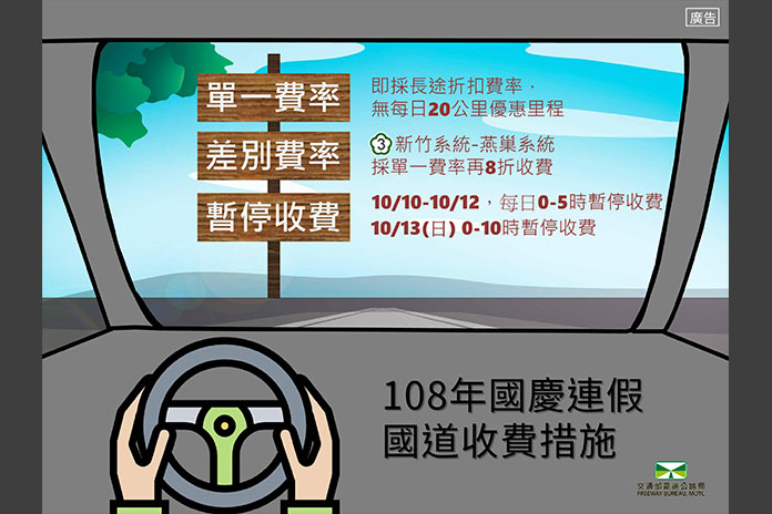 高公局強調,分散車流及短程旅次,國慶連假收費措施為10月10日至13日實施單一費率、國道3號「新竹系統至燕巢系統」採單一費率再8折收費及深夜0-5時暫時收費,10月13日收假延長暫停收費時段至10時,用路人注意訊息,行車平安。
