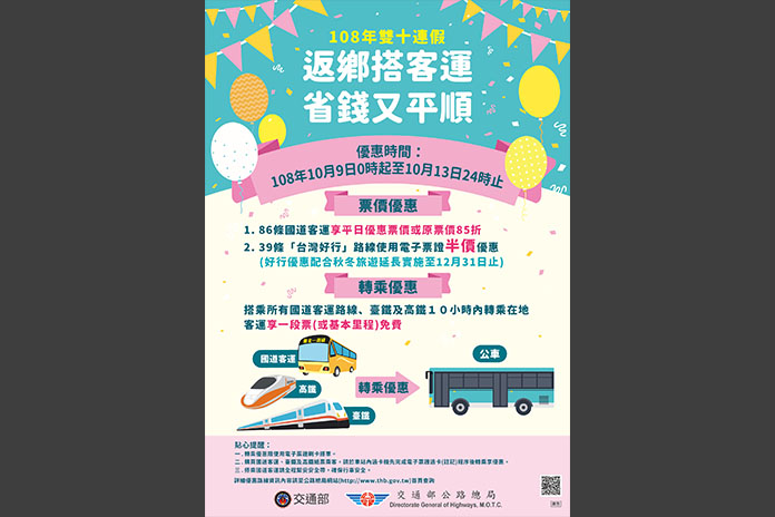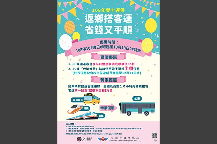 交通部公路總局今(1)日表示,因應雙十連假民眾返鄉出遊,避免國道雍塞,鼓勵搭乘大眾運輸交通工具提供優惠如下: