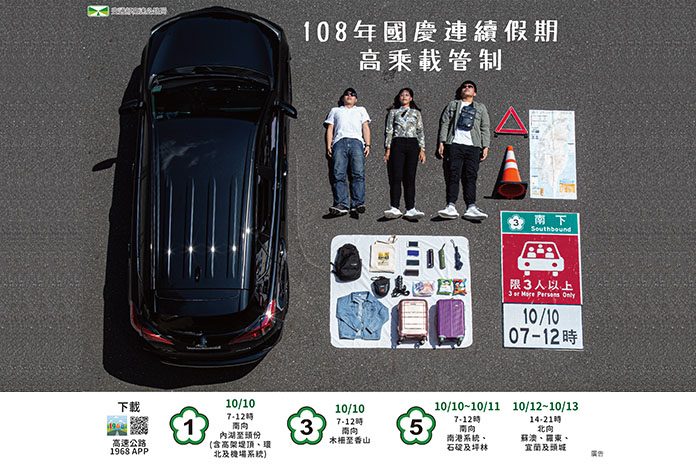 有關本次國慶連續假期相關收費措施及高乘載管制說明詳附圖一、二,高公局預祝大家國慶假期快樂、行車平安。