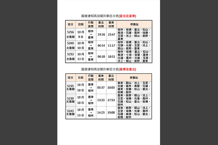 生活 國慶假期台鐵加開班車疏運旅客 由 獨家報導 - 2019 年 10 月 4 日 下午 11:10 FacebookTwitterWhatsAppLINECopy URL 交通部台鐵局表示,因應國慶假期旅運需求,自2019年10月9日至14日,共計6天,東線再加開自強號6班。 文:莫子涵|圖:編輯部 交通部台鐵局表示,因應國慶假期旅運需求,自2019年10月9日至14日,共計6天,東線再加開自強號6班。 國慶假期再加開加班車自10月5日零時起,開放網路及電話語音訂票,相關加開車次、時刻,即日起在台鐵網站(網址:http://www.railway.gov.tw),及各車站公告。