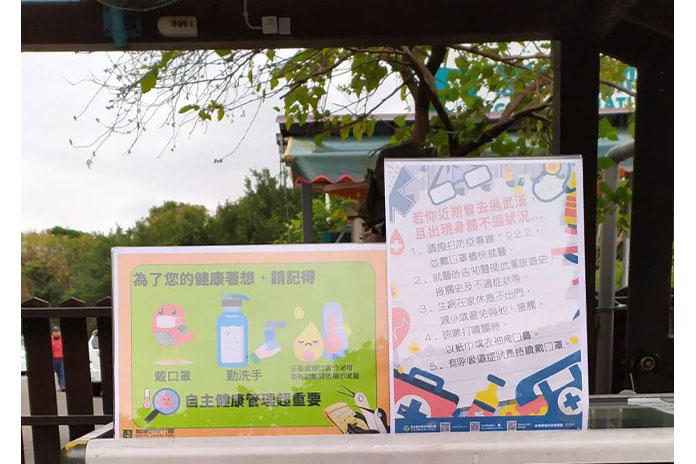 關渡自然公園管理處說明,近期國際間嚴重特殊傳染性肺炎(COVID-19)疫情仍未降溫,為防範疫情擴散並掌握資訊,以利未來配合中央流行疫情指揮中心調查需求,除入園採實名制外,園區工作人員亦每日監控體溫及全程配戴口罩,園區內的自然中心為唯一1處室內空間,在景觀區座位為維持室內社交安全距離,將休憩桌椅間隔1.5公尺,並提供酒精噴劑供手部消毒,以維護參觀遊客的安全。