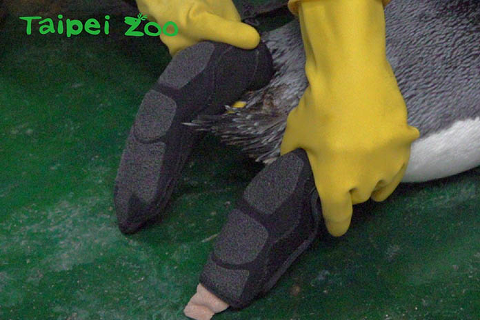除了正在換羽的國王企鵝們住在後場的「更衣室」,還有幾隻腳掌受傷感染而產生趾瘤的個體正在治療中,為了避免牠們的腳掌直接踩踏地面、沾染糞尿髒污,目前住在「醫療房」裡,動物園專業的獸醫師們特別與廠商合作,使用3D列印技術印製企鵝腳掌,製作出完全符合企鵝腳型的特製「防水鞋套」,穿上鞋套之後可以包覆上藥的腳掌,也能隔絕水與髒汙、避免再次感染,藉此使國王企鵝們的趾瘤傷口加速痊癒。