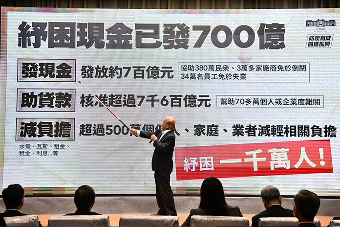 政府在紓困方面採用「發現金」、「助貸款」、「減負擔」三面向,而紓困方案推出後至今已一個多月,1萬元的紓困申請,已有約23萬人核准,發出金額約31億元。在「發現金」方面,已發放約新台幣700億元,協助約380萬名民眾及3萬多家的廠商免於倒閉,及34萬名的員工免於失業;「助貸款」部分,目前已核准超過新台幣7,600億元,幫助逾70多萬的個人或企業度過難關。