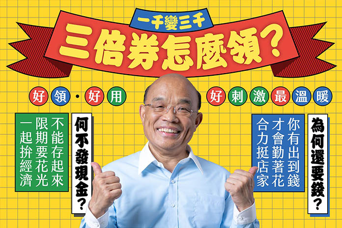 政院長蘇貞昌於臉書頁FaceBook貼出振興三倍券全攻略,讓民眾可以輕鬆秒懂,內容提到台灣防疫有成,世界也看到台灣。現在我們要一起讓經濟復甦、大家過正常日子,這次結合暑假檔期,推出讓1,000變3,000的振興三倍券,要讓大家好領、好用、好刺激,也最溫暖。