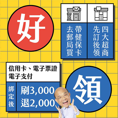 郵局超商都好領,不拿紙本券,還有數位支付可以嗶。刷滿三千退兩千,比算里程還方便。網站預購超商取券:7/1起上網預購,刷卡繳費、選擇領券超商。或7/1/~7/7到超商事務機插卡憑單繳費。7/15起即可到指定超商領券。郵局直接買:7/15起,帶健保卡去郵局櫃檯直接買、直接用。