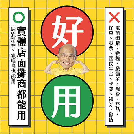 店家攤商展演票券,到處都能用,你家巷口那一家,一起出錢買爆他。可以買:實體店面、餐飲、夜市、傳統市場、商圈、藝文活動、高鐵與台鐵等。不能買:電商網購、繳稅、繳罰單、規費、菸品、保單、股票、國民年金、卡費、禮券、儲值。