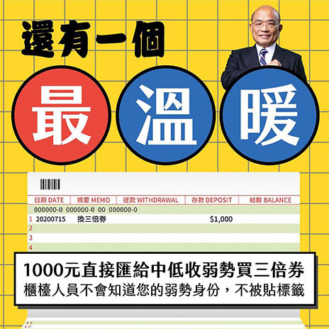 *沒有一千怎麼換三千?政府直接匯1,000讓你去換券。不會讓櫃檯人員知道弱勢身份,因為在乎,所以溫暖。