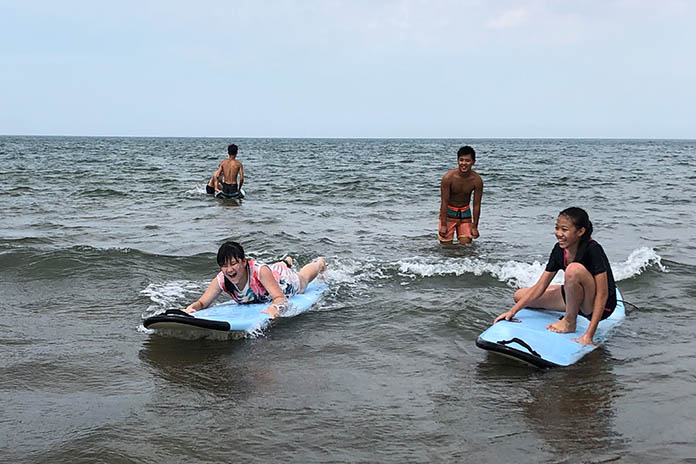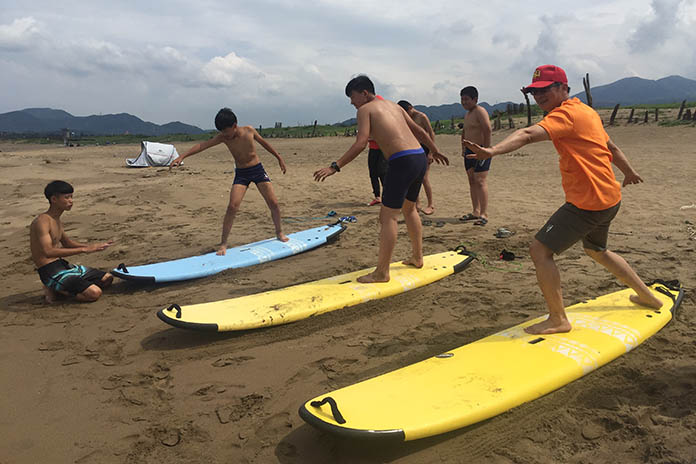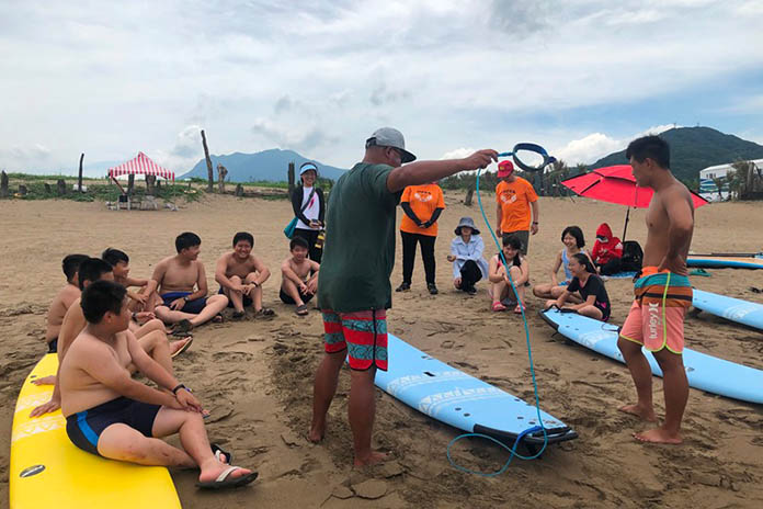 衝浪中心的的傅君然教練與教練群們,為學生進行衝浪中心的環境介紹與使用規則說明,學生們開始換裝準備進行衝浪體驗課程,跟著教練示範衝浪的姿勢,從上板、手部滑水、起身,學生們依步驟一一進行練習,傅教練說, 只要下水前先接受教練的技巧指導及經驗分享,各年齡階層的民眾都能享受追浪快感,九成以上的初學者都成功上板。