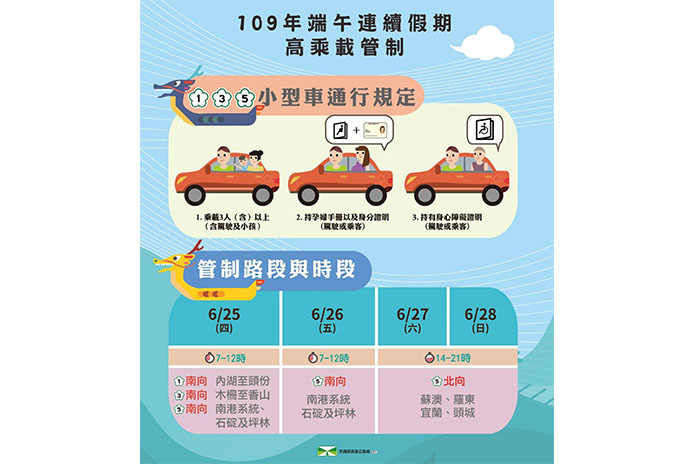 高公局說明,為疏導端午連假國5大量交通需求,將實施匝道儀控及尖峰路段分向高乘載管制,而高乘載管制時段內車流量仍超過路段容量,且高乘載管制前後時段,仍有大量非高乘載車輛的交通需求,南向往宜蘭方向的車潮一早即出現回堵現象,北向往台北方向的車流則易雍塞到深夜才紓解,請排隊車輛耐心等候。