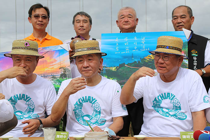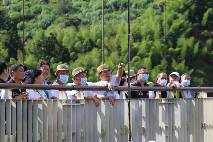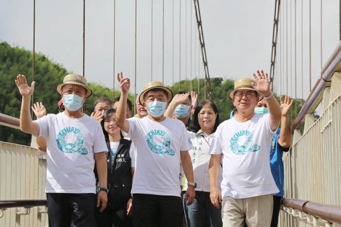 嘉義縣長翁章梁和立委陳明文在橋上向阿中部長解說雲林、嘉義和台南的位置,還說天氣好的話,也能看到海和澎湖,接著在雲梯觀景台茶席聆賞太平國小樂器演奏,喝上一口阿里山高山好茶。部長說:「高山茶香醇很好喝。」