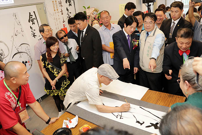 賴清德副總統表示,今天是新冠肺炎防疫解封首日,很高興能夠回到台南,參加陳吉山老師新書發表會的活動,陳老師師承大家所尊敬的朱玖瑩大師,同時他本身劍道七段,讓他的書法蒼勁有力、力透紙背,且夫妻恩愛情深,又將古今中外名師書寫在紙上,構成一幅美麗的畫,這樣的作品的確是值得推廣。