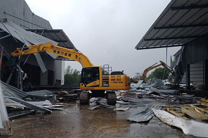 新北市工務局表示,5月起梅雨季節來臨,新北市各地豪大雨不斷,不肖業者趁著大雨期間在林口太平嶺試圖興建超大型鐵皮屋出租牟利,拆除大隊接獲舉報後,比對發現違建面積高達8000平方公尺,於是立即發文認定違建並勒令停工限期改善,想不到違規民眾竟然不予理會繼續趕工搶建,公然藐視市府公權力,因此拆除大隊於5月底日派員執行,當日現場雖然下著豪大雨,拆除大隊同仁仍不畏風雨以機具將鐵皮屋違建全部拆除,從接獲舉報到完成拆除不到一個月的時間,本次拆除也創造了近10年來單次個案最高拆除面積的紀錄。