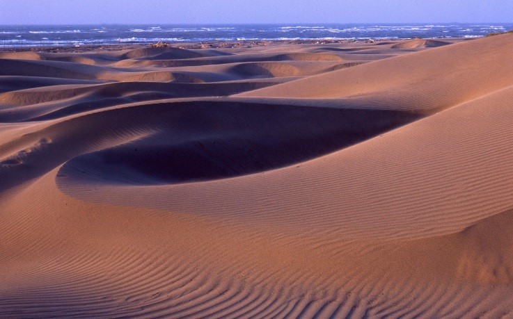 *台南七股的「頂頭額沙洲」是由季風和地形所形成的沙丘,一眼望去是隨著風向而改變的不規則沙丘曲線,表面有因風形成的紋理,使這裡有台灣版的撒哈拉沙漠之稱,當夕陽西下時分,整片沙洲起伏的光影線條變的明顯起來。