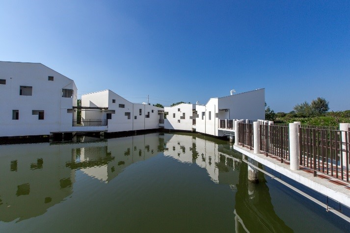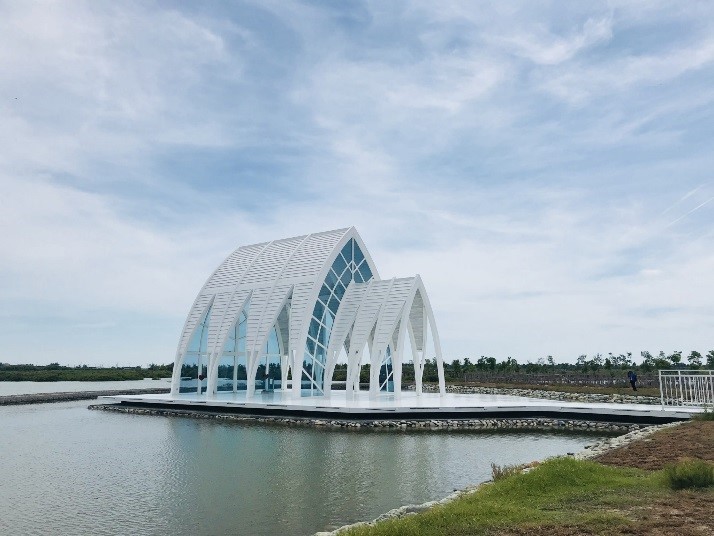 *安平區的「台江國家公園遊客中心」坐落在一方水池之中,高腳屋群像極了馬爾地夫的水上渡假村,一面面潔白的牆面點綴著一塊塊黑色玻璃,像是一面大型俄羅斯方塊,豔陽照射下的水面倒影瞬間成為遊客瘋傳的唯美拍照景點。