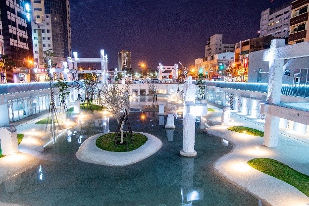 *台南新景點「河樂廣場」的設計頗有古羅馬希臘斷壁殘垣的味道,不僅是市區最大親水廣場,更屢躍國際媒體網站獲得建築設計獎項,夜晚的親水公園倒影更添詩意。
