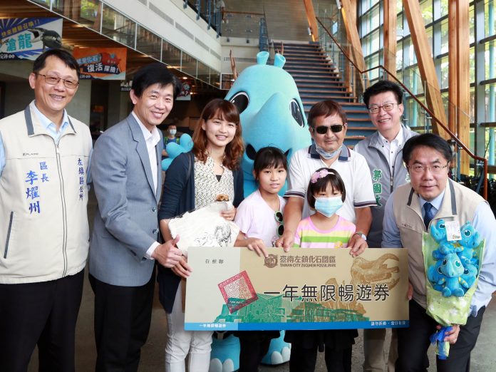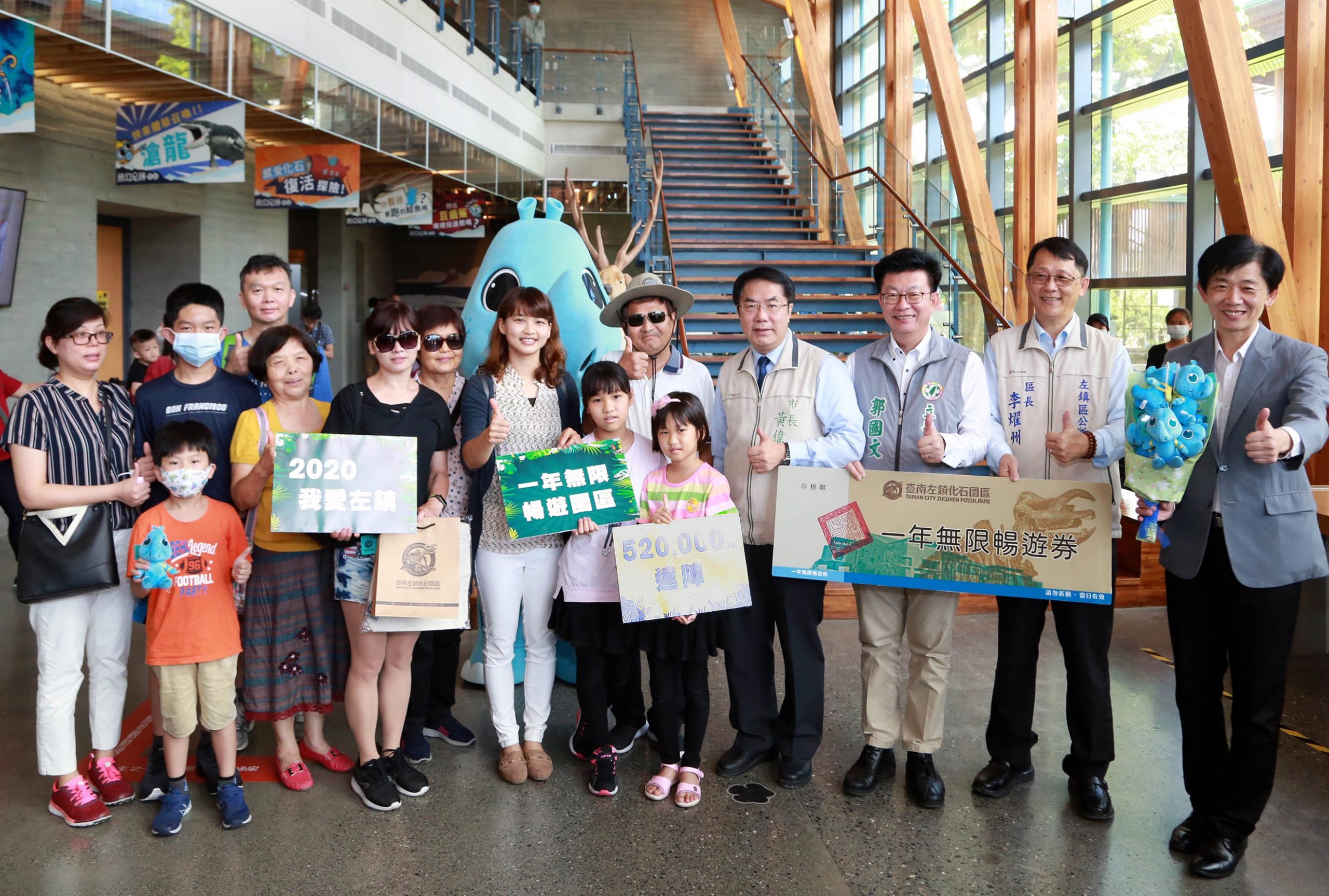 運兒終於出爐!台南左鎮化石園區開心宣布達成52萬人次入園的亮眼佳績,台南市長黃偉哲14日特別出席「2020我愛你-52萬名探險家達陣」活動,在場見證並頒贈「1+1一年無限入園年票」給來自嘉義一家五口、三代同堂的7歲黃小妹妹,恭喜她成為第52萬名入園幸運遊客,未來只要持此張特殊票券,1年內皆可與1位陪同者無限暢遊園區,黃小妹妹一家人得知獲獎又驚又喜。此外,園區也貼心為第52萬名前後一組遊客準備限量的文化局文創商品,讓他們也分享幸運兒的喜氣,同時也希望帶動防疫新生活運動的另一波觀光人潮。