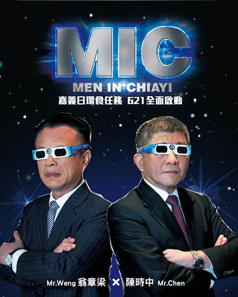 義縣為行銷6月21日的日環食天文盛事,陸續推出「太陽神」、「專業的人」及「觀日任務」等創意話題,粉絲紛紛期待縣長翁章梁還有什麼奇招,果然不負眾望,驚見6月13日晚間翁章梁再次於臉書粉專曝光文宣,帥氣度破表的翁章梁搭檔超強業配王陳時中,戴上專業觀日太陽眼鏡,酷扮MIC星際戰警「Men In Chiayi」。