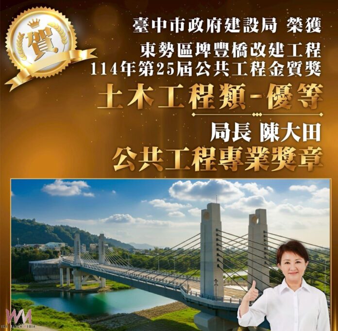 建設局表示,公共工程委員會日前公布第25屆公共工程金質獎,市府建設團隊以「東勢埤豐橋改建工程」兼顧防災韌性與使用安全,強化通洪能力及橋梁結構穩定,並同步納入景觀、生態及施工期間交通維持等考量,具體展現以人為本的工程精神榮獲「優等」佳績。另於第26屆國家建築金獎中,「清水國民暨兒童運動中心興建工程」及「北屯國民暨兒童運動中心興建工程」同步獲得「施工品質類公共建設優質獎」,其中清水國民暨兒童運動中心更勇奪「全國首獎」,充分展現台中公共工程在品質管理與專業執行上的整體實力。