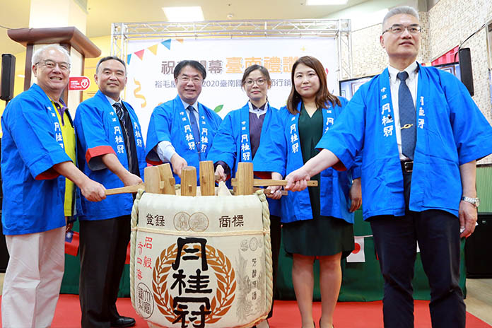 台南市長黃偉哲與台中市政府副秘書長陳如昌、農糧署南區分署副組長黃瑞呈、日本茨城縣笠間市交流事務所(駐台辦事處)處長木下知香及裕毛屋董事長謝明達等各界貴賓共襄盛舉,一同參與鏡開祈福儀式,透過敲開清酒桶,期盼迎來銷售佳績。