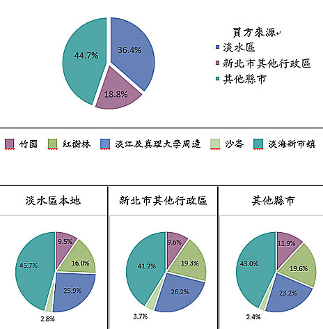 由交易件數資料可知,淡海新市鎮生活圈交易熱絡居冠,主因為新興開發區各項建設陸續到位,交易件數佔全淡水區43.7%。觀察購屋者來源,總計五大生活圈中以其他縣市購買者占44.8%最多,淡水本地購買占36.4%,新北市其他行政區占18.8%,顯示淡水區不動產具有悠活樂居優勢,深受外來客喜愛。