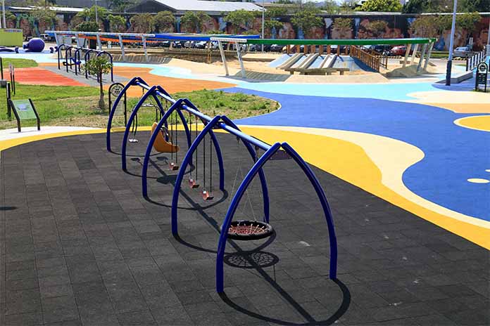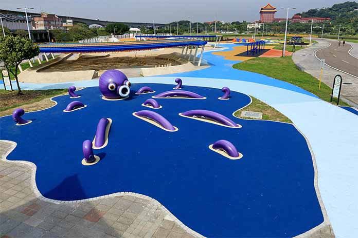 大佳河濱共融式遊戲場第三期以海洋為主題來設計,遊戲場化身為繽紛熱鬧的大海。
