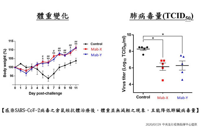 先前研究團隊已成功鑑定出,具備中和SARS病毒能力的抗體,其辨識病毒棘蛋白spike protein胺基酸序列與新冠病毒棘蛋白胺基酸序列完全相同。研究團隊為了驗證該抗體在COVID-19的治療潛力,先透過新冠病毒來感染細胞的試驗,發現該抗體抑制新冠病毒感染細胞的能力相當顯著。此外,研究團隊已展開動物試驗的階段,在倉鼠的感染模型中,以新冠病毒感染倉鼠(每組5隻)後,再分別以Mab-X或Mab-Y抗體進行治療。實驗結果發現,未接受抗體治療的倉鼠體重明顯減輕,活動力也跟著下降;而接受抗體治療的倉鼠,體重與活動力則無明顯的影響。更重要的是,原本感染新冠病毒的倉鼠,肺臟的病毒量非常高,而接受抗體治療的倉鼠,肺臟病毒量竟然降低了100倍之譜,效果相當驚人。