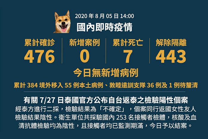 央流行疫情指揮中心於8月5日表示,台灣接獲日本官方透過國際衛生條例國家對口單位IHR National Focal Point通知,該國確診1名自我國返日之COVID-19武漢肺炎無症狀感染者。
