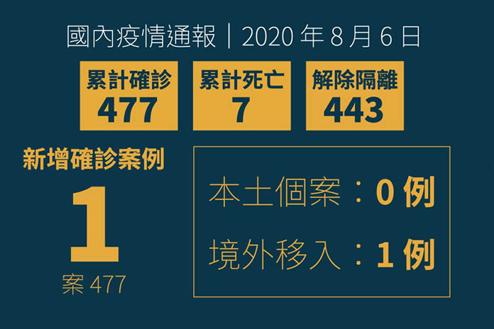 經進入8月的台灣在境外移入COVID-19武漢肺炎病例不斷新增,更讓人民於後疫情時期充滿一次次驚愕與不安。中央流行疫情指揮中心於6日公布國內新增1例境外移入COVID-19武漢肺炎病例,為60多歲男性(案477),長期於南非工作,前次自台灣出境時間為2016年11月,與7月27日公布之案460、案461一同自南非返國,7月25日入境。