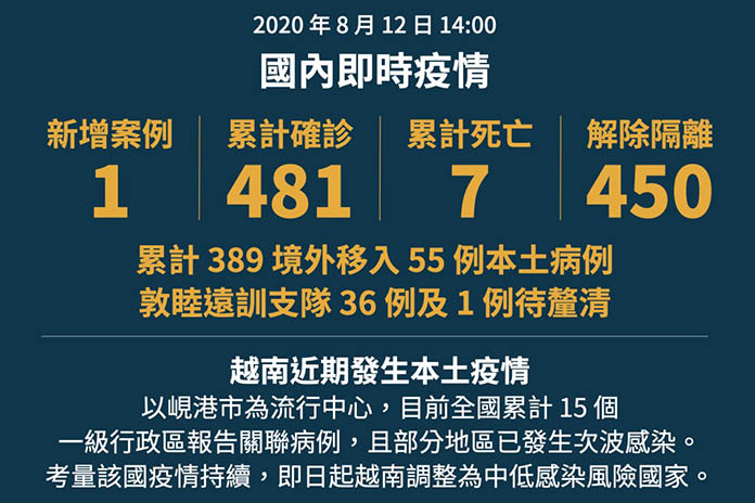 灣陸續出現境外移入確診病例,中央流行疫情指揮中心12日表示,新增1例COVID-19武漢肺炎境外移入確診個案(案481),國內截至目前累計通報83,828例(含82,776例排除),其中481例確診,分別為389例境外移入,55例本土病例及36例敦睦艦隊,另1例待釐清。確診個案中7人死亡、450人解除隔離、24人住院隔離中。