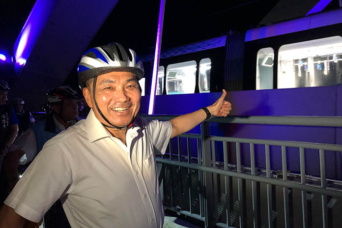 *新北市長侯友宜騎單車視察淡海輕軌藍海線。