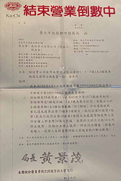 有70年歷史的上海點心老店永康街「高記」,將在8月底結束營業,其Facebook臉書專頁貼出北市都發局公文通知函。在永康街高記總店。因違反營建法規,除了被開罰24萬罰鍰外,也將被斷水斷電,最快恐8月底熄燈。