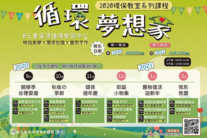 *新北市環保局辦理為期6個月的環保教室課程,9月至11月課程於8月26日中午12時起開放報名,12月至2021年2月課程則於10月16日開放報名。