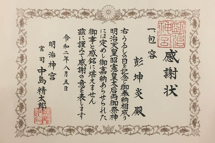 明治神宮原本配合2020東京奧運會將舉辦盛大慶祝活動,但因新冠肺炎疫情暫緩。彭坤炎於近日接獲日方通知表示原先預定由明治神宮舉行表彰式公開頒發感謝狀也因疫情取消,並收到來自日本明治神宮致贈感謝狀和禮品。雖因疫情影響取消表彰式,本中心欣聞彭坤炎工藝師獲此殊榮,代為公佈喜訊,分享國人同胞。對於其對台灣工藝的奉獻,給予崇高的肯定與敬意。