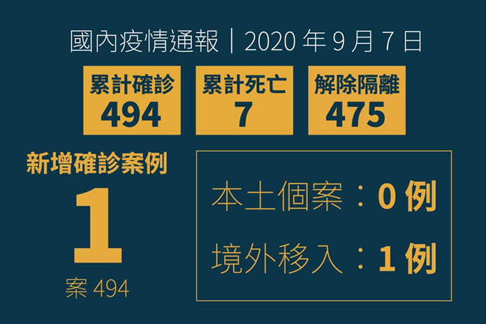 *9月7日再公布台灣新增1例境外移入COVID-19武漢肺炎病例,為本國籍20多歲男性(案494),2020年2月至尼泊爾參加宗教活動,9月3日與友人一同返國。