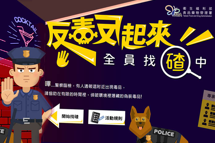 為教導民眾識別混合式偽裝毒品,衛生福利部食品藥物管理署於2020年9月9日推出一款「反毒反起來,全員找碴中」線上遊戲,邀請到電競實況主小熊於線上一起體驗此款反毒遊戲,並號召粉絲共同參與,遊戲中設計多種偽裝毒品埋藏於場景內,包含常見的毒咖啡包、毒糖果及毒梅子粉等,玩家只要在時間內找出所有偽裝毒品即可過關,食藥署更特別限時加碼,即日起至10月11日止,玩家只要過關並填寫完整資料者,就能參加反毒好禮抽獎活動,希望藉此吸引民眾對反毒議題的關注,讓民眾從遊戲中學習如何識別偽裝毒品,提升對偽裝毒品的認知,強化自我保護力,全民一起反毒反起來。