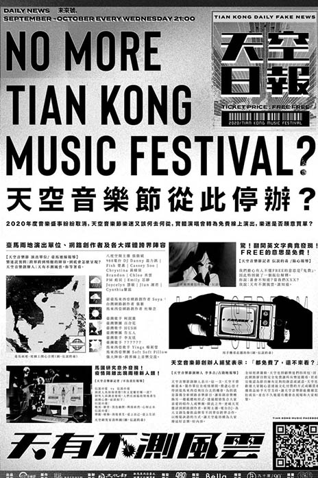 文化部、駐馬來西亞台北經濟文化辦事處與耳福音樂合辦的《2020天空音樂節Tian Kong Music Festival 》,將於9月16日至10月28日,每周三晚上9點,透過天空音樂節與馬來西亞988電台的臉書專頁,免費網路直播音樂節目「天有不測風雲」,節目將結合新聞播報的方式與廣大的樂迷朋友們相會。