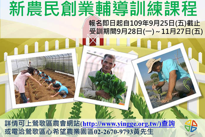 新北市農業局為推動有機農業,並吸引青年返鄉,保持農業高競爭力,從2009年與鶯歌區農會合作成立心希望農業示範園區,推出「新農民創業輔導訓練課程」,邀請農業改良場各領域專家、大專院校講師到場授課,內容包含「農業基礎知識介紹」、「有機農業生產技術解說」及「農產品分級包裝與行銷」等課程,由生產基礎理論導入,並配合田間實作訓練,適合從農新手參加。