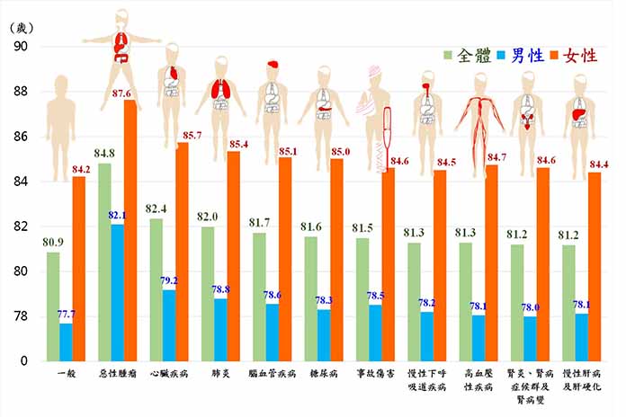 且女性高於男性者有心臟疾病、肺炎、糖尿病、高血壓性疾病與腎炎、腎病症候群及腎病變,顯示男、女性在主要死因上的差異,可能與從事職業、生理條件、飲食習慣或生活壓力等因素有關,致各類死因對兩性平均壽命的影響程度有所不同。