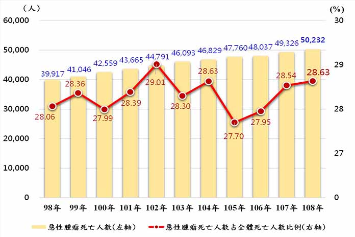 其中,影響程度最大的惡性腫瘤,已連續38年居國人死因首位,且死亡人數連續11年攀升,近年來其死亡人數占全體死亡人數的比例皆在2成7以上,而導致惡性腫瘤死亡人數增加的原因繁多,主要可能與吸菸、飲食習慣、生活環境、工作壓力等諸多因素有關。