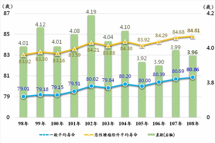 近年來加強惡性腫瘤預防宣導及醫療工作,編算結果發現排除特定死因為惡性腫瘤的平均壽命與一般平均壽命差距,已由2013年的4.19歲減至2019年的3.96歲,近4年均低於4歲。