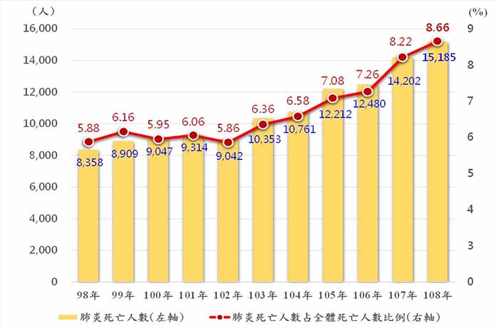 此外,肺炎為國人十大死因第3位,其死亡人數及所占比例已持續6年增加,經統計,排除死因為肺炎的平均壽命與一般平均壽命差距,由2013年之0.79歲增至2019年之1.13歲,顯示肺炎防治及宣導工作仍需持續重視。