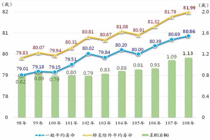 內政部今(16)日公布「2019年特定死因除外簡易生命表」,十大死因如排除居國人死因之首的惡性腫瘤,2019年國人平均壽命為84.81歲,較一般平均壽命80.86歲增加3.96歲,影響最大;其次,排除居第2位死因的心臟疾病,平均壽命可增加1.50歲;再次,排除居第3位死因的肺炎,平均壽命將增加1.13歲。