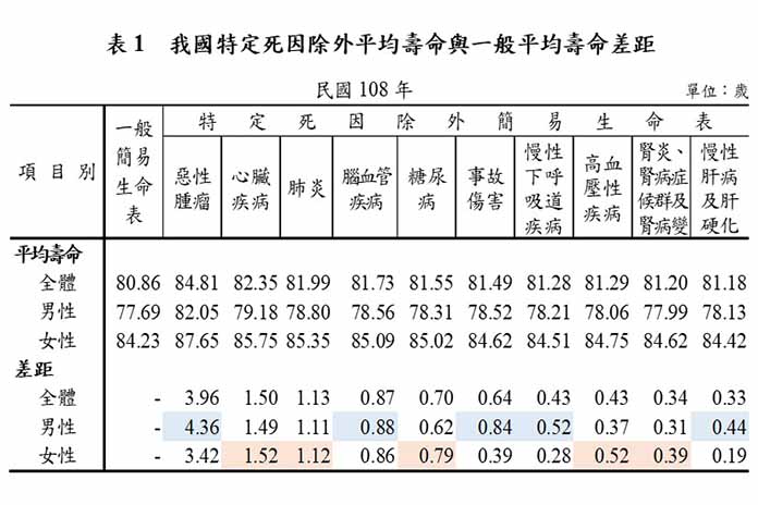 內政部說明,就性別觀察,男性在特定死因除外,平均壽命與一般平均壽命差距高於女性的死因者,包括惡性腫瘤、腦血管疾病、事故傷害、慢性下呼吸道疾病與慢性肝病及肝硬化。