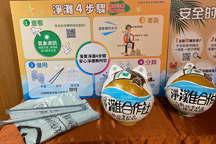新北市環保局張旭彰副局長說明,大家也許有到海邊遊玩看見沙灘上有垃圾,臨時想幫忙撿拾,卻因手邊沒有工具而作罷,或是發生清理完不知道該丟何處的窘境。為方便民眾做環保,環保局與北海岸店家合作推出「淨灘合作社」,民眾只要到掛有「淨灘合作社」浮球的沿海店家填寫工具借用表,取得淨灘工具後即可清理海岸線,而在結束後,再將所清除的垃圾交給店家,後續清潔隊將會前往收運。
