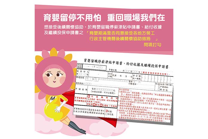 勞動部指出,為落實育嬰留職停薪制度及保障受僱者期滿復職之權益,主動針對申請育嬰留職停薪之受僱者提供後續關懷協助,透過手機簡訊關懷服務、編印宣導摺頁加強權益通知,並提供職業訓練及就業服務資源、法律諮詢及訴訟扶助等訊息,另外,也透過網站、臉書及辦理研習會等多元管道,加強宣導育嬰留職停薪及期滿復職等相關規定,以保障受僱者權益。
