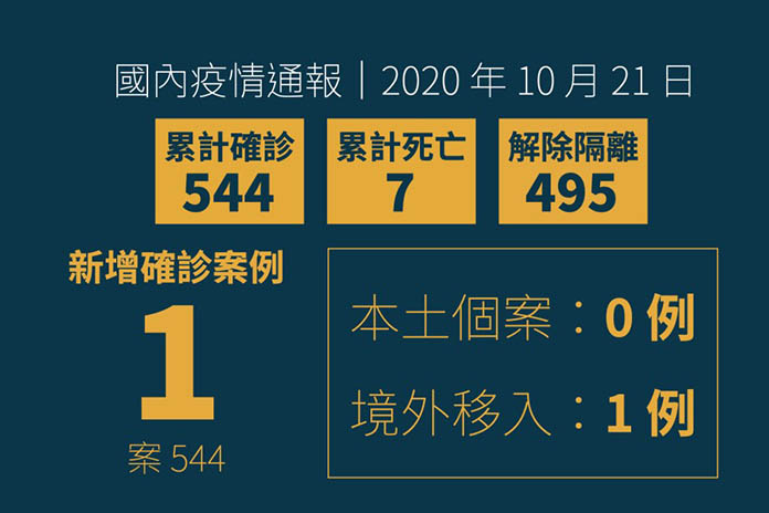 中央流行疫情指揮中心10月21日公布台灣新增1例境外移入COVID-19武漢肺炎病例(案544),為10多歲印尼籍男性,10月5日與5名印尼籍同學一同入境台灣就學。
