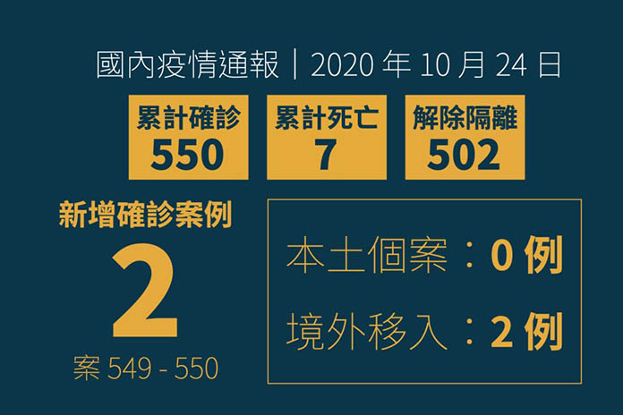 案550為30多歲本國籍男性,2020年10月2日出境至美國,並於10月18日返國,入境時無不適症狀。個案於10月21日居家檢疫期間出現發燒、咳嗽、肌肉痠痛、關節痛及全身倦怠等症狀,由衛生單位安排就醫採檢,並於10月24日確診,目前住院隔離中。由於個案發病前2日均於住家進行居家檢疫,未有同行及同住接觸者,因此無匡列接觸者。