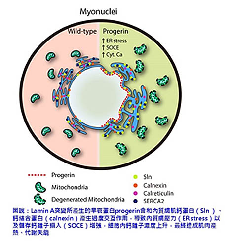 國家衛生研究院生技與藥物研究所紀雅惠副研究員研究團隊透過基因工程的方法將造成早衰症的突變基因─早衰蛋白progerin導入小鼠肌肉細胞,藉此研究肌肉功能與壽命之間的關聯性。研究發現,早衰蛋白會與肌肉細胞內質網的肌鈣蛋白sarcolipin產生過度的交互作用,造成肌肉細胞內的鈣離子失去恆定,影響肌肉細胞在體溫調節與代謝上等功能,進而導致小鼠壽命縮短,顯示肌肉功能的衰老程度與壽命的長度有明顯的相關性。此研究成果已於今2020年2月發表於國際細胞老化研究頂尖期刊《Aging Cell》。