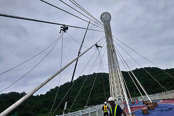 新北市於日前辦理汐止區河濱公園內「星光橋」橋塔清洗,麥克風造型的橋塔高75公尺,加上往北傾斜與水平夾角呈70度,清洗難度相當高,但為了亮潔橋塔維持景觀,清潔人員除了掛吊籠,還需身綁工具及安全裝備全程靠著腳和腰力爬上去刷洗,簡直是現實版蜘蛛人!