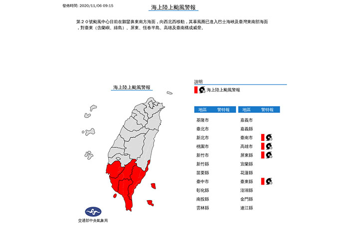 氣象局說明,陸上警戒範圍包括臺東(含蘭嶼、綠島)、屏東、恆春半島、高雄及臺南,應嚴加戒備並防強風暴雨;海上警戒範圍則有巴士海峽、臺灣東南部海面、臺灣海峽級東沙島海面,航行及作業船隻應嚴加戒備。